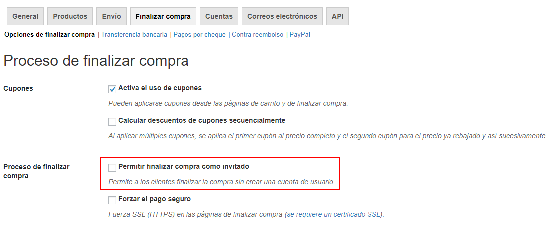 Para desactivar dicha función, ves al apartado WooCommerce/Ajustes, pulsa en la pestaña Finalizar compra y desmarca el campo Permitir finalizar compra como invitado.