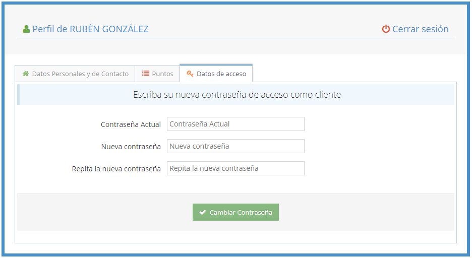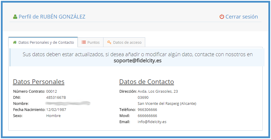 Puedes insertar una sección en tu web para que los clientes puedan consultar sus puntos, datos personales y cambiar su contraseña. La integración es muy sencilla, solicita el iframe de consulta de puntos a nuestro soporte técnico soporte@fidelcity.es y te enviaremos el código que deberás insertar en tu web.