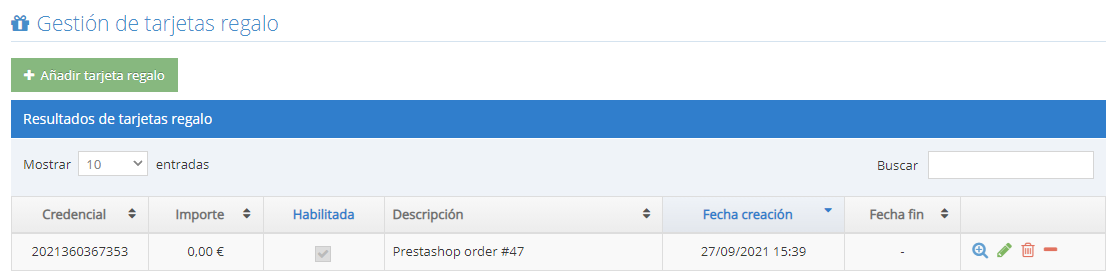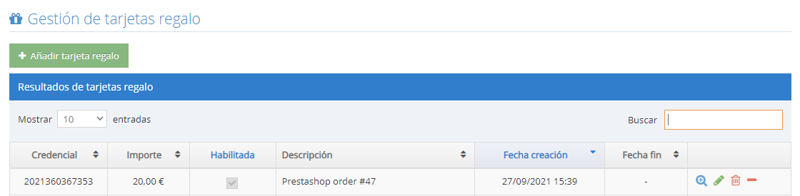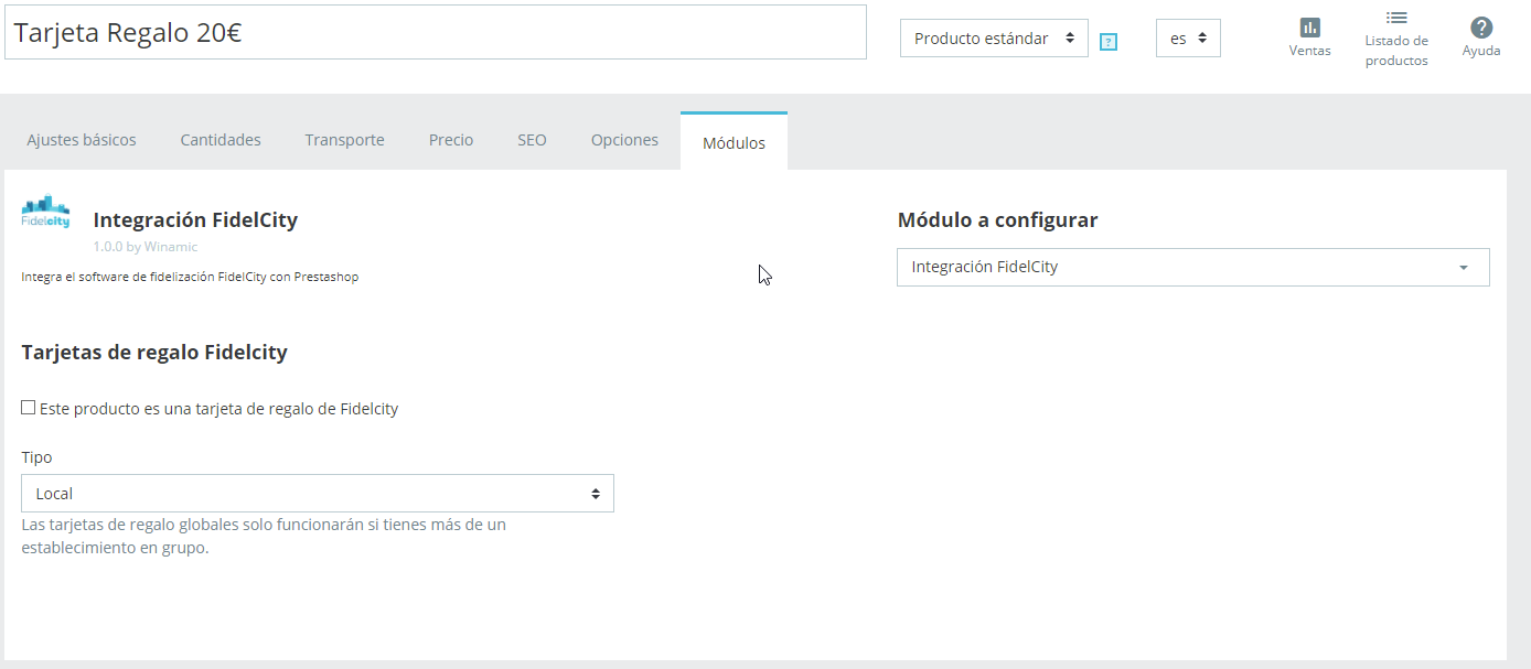 Además se puede crear un producto llamado Tarjeta Regalo dentro de Prestashop de manera que se registre automáticamente en FidelCity. Simplemente, se debe dar de alta el producto marcando la opción "Este producto es una tarjeta de regalo de FidelCity".