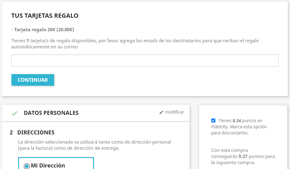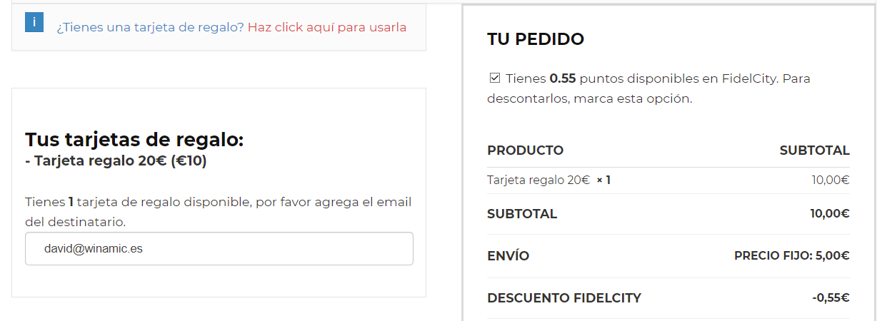 Para crear en fidelcity una tarjeta regalo se añade al carrito el producto y añadimos el correo del destinatario.