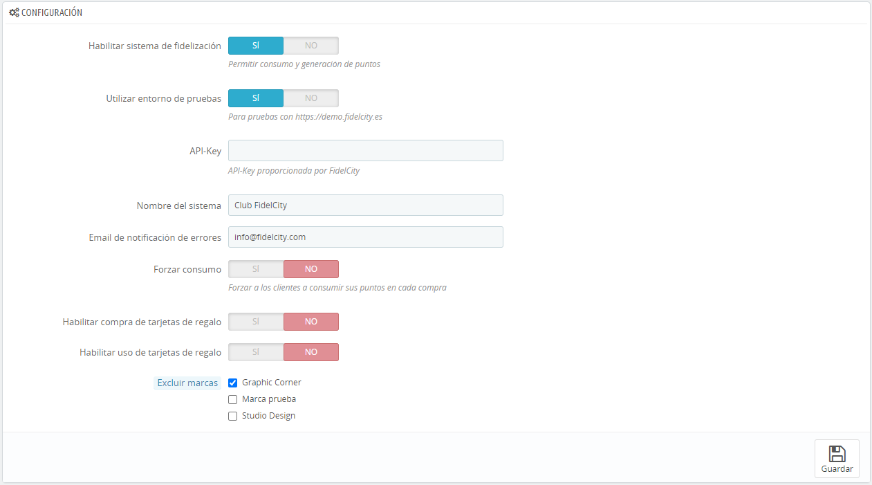 Una vez instalado, pulsa en Activar plugin. Después, entra en Ajustes/FidelCity y rellena los siguientes campos: