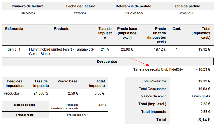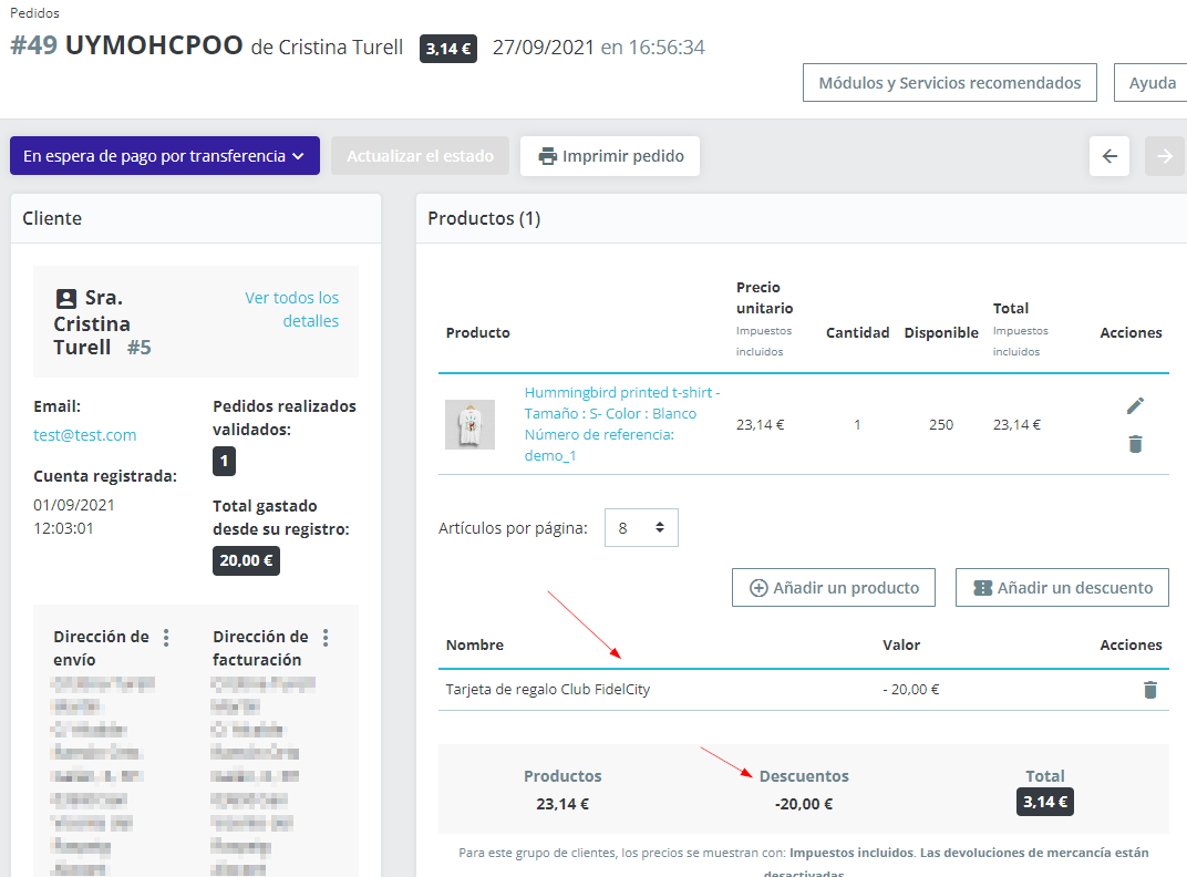 El administrador de la tienda online podrá ver en cada pedido el descuento aplicado mediante FidelCity.
