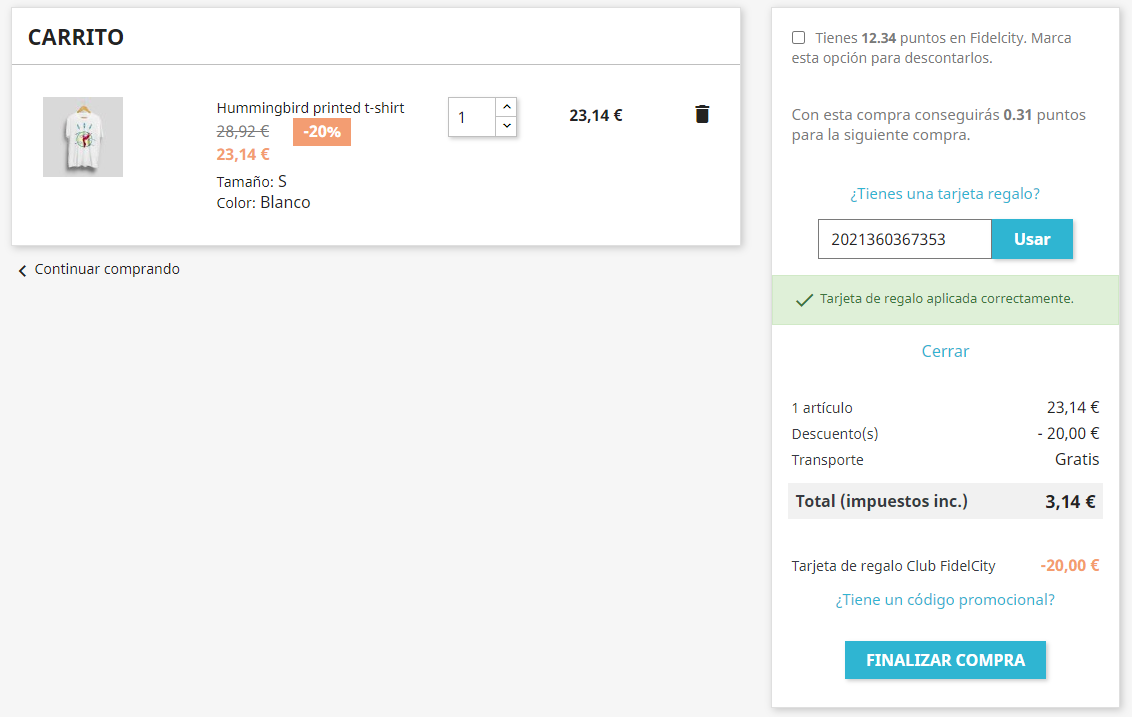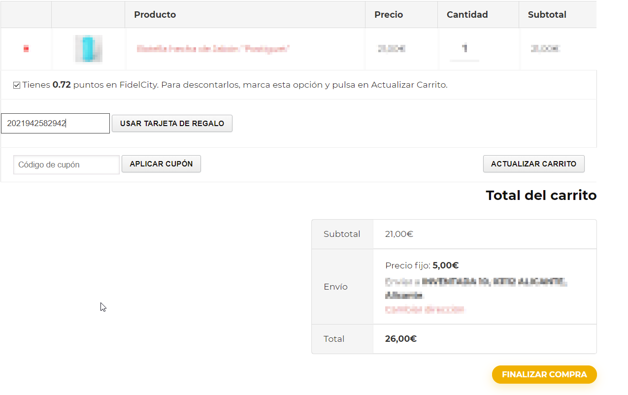 Cuando un usuario quiera consumir una tarjeta regalo comprada previamente, ya sea en la tienda física o tienda online, en el resumen del carrito podrá escribir el código de la tarjeta regalo y pulsar en "usar tarjeta de regalo".