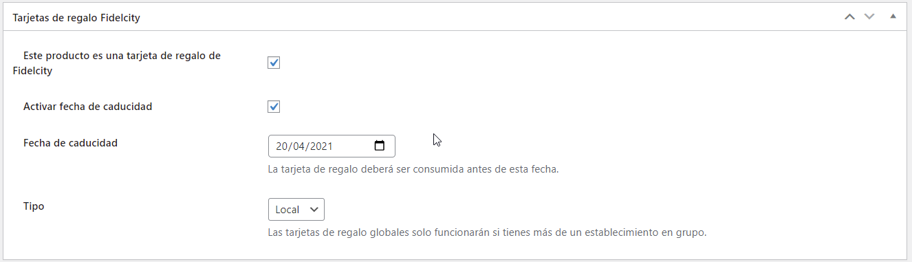 Además se puede crear un producto llamado Tarjeta Regalo y dentro de este activar el check. Para que se active, configurando la fecha de caducidad y el tipo de comercio