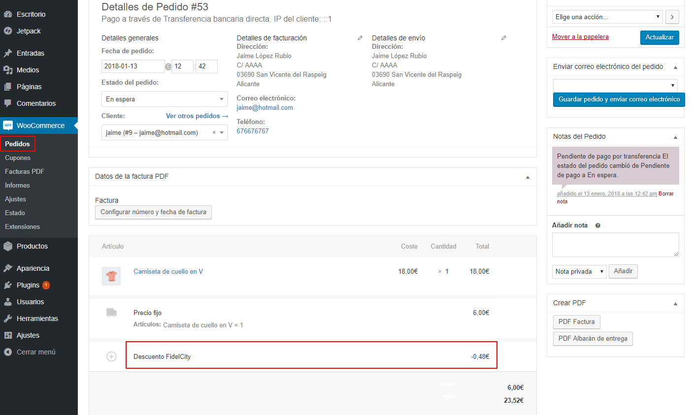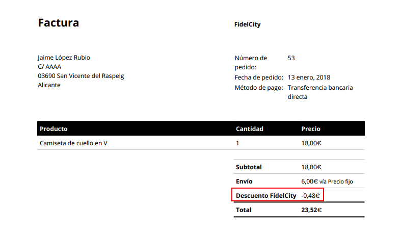 El descuento también aparecerá en la factura PDF, en caso de utilizar algún otro plugin para ello, como WooCommerce PDF Invoices & Packing Slips